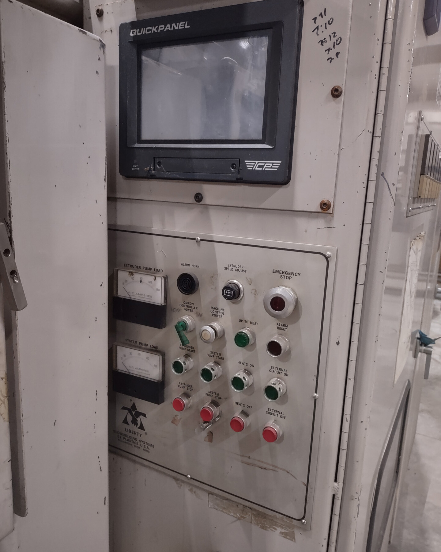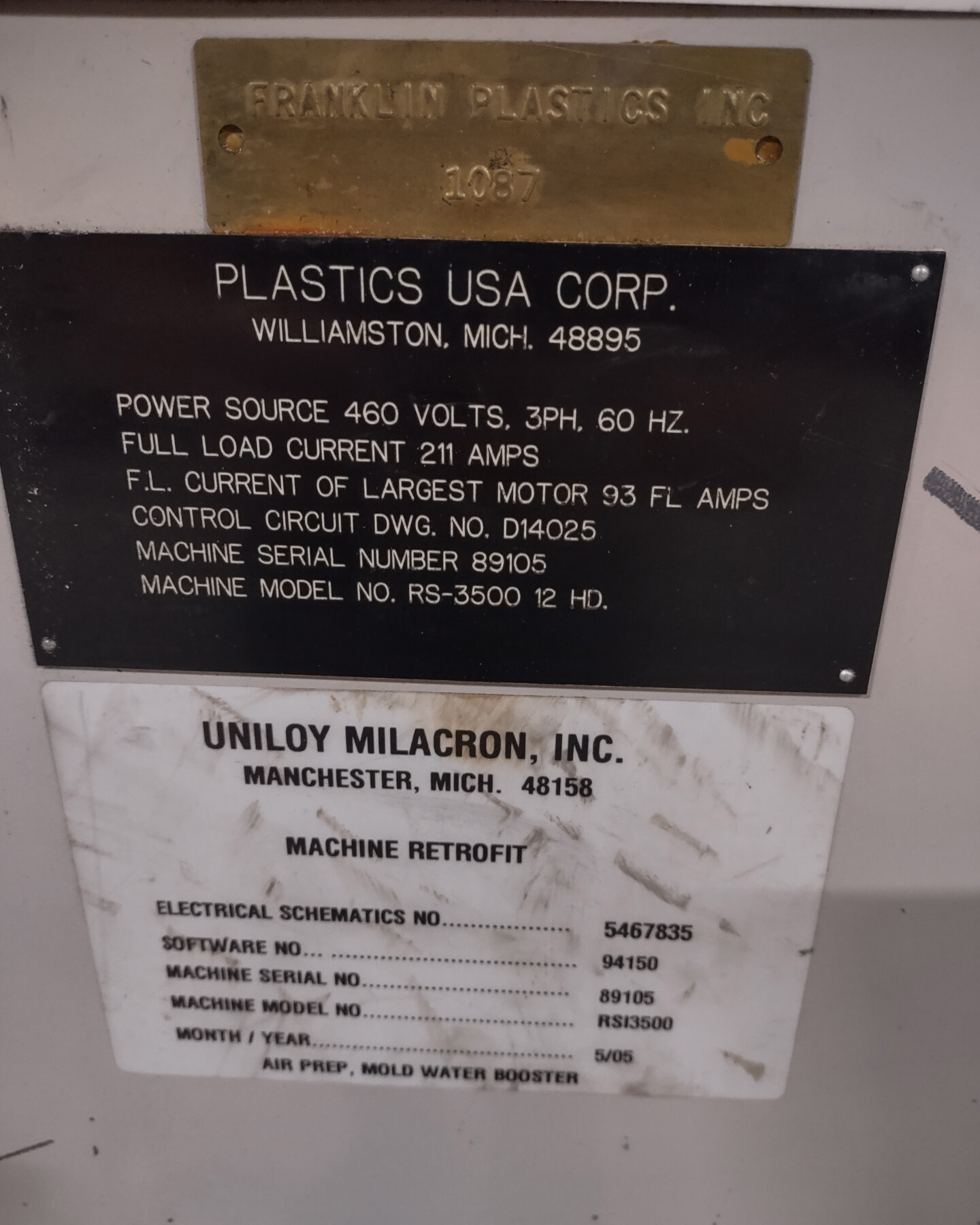 | Additional Details: | Hydraulic Extruder Drive, Air-cooled extruder barrel (missing fans), Dual Rotac clamping, Machine retrofit performed by Uniloy Milacron 5/05, Comes with upright conveyor takeaway system. |
