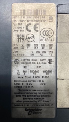 | Power: | 480VAC(contactor coil) |