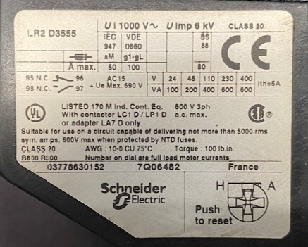 | Name: | Schneider Electric-Telemecanique LC1D4011 Contactor with LR2D3555 Overload Relay |