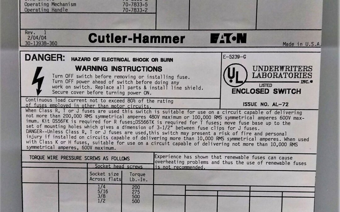 | Name: | Cutler-Hammer DH365NGK General Duty Safety Switch |