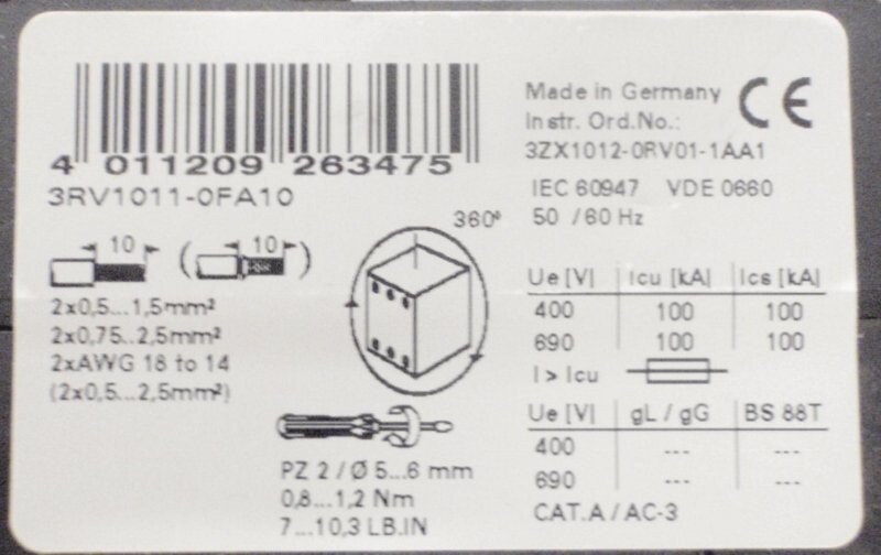 | Name: | Siemens 3RV1011-0FA10 Circuit Breaker |