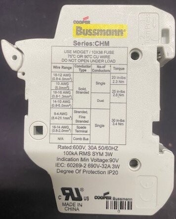 | Name: | Cooper Bussmann CHM3DU 3-Pole Midget 10X38 Fuse Holder |