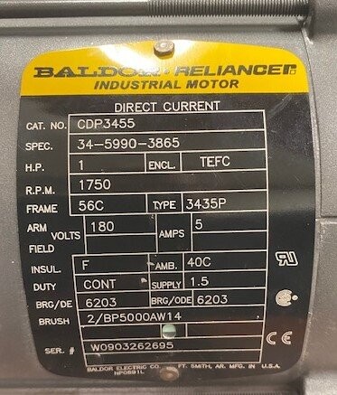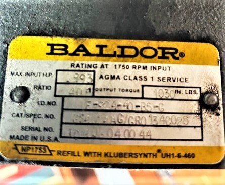 | Additional Details: | For Gear Reducer: Max Input HP: .993 - Output Torque: 1030 In. Lbs. Baldor Reliance Motor: Cat. No.: CDP3455 - Spec.: 34-5990-3865 - 1 HP - Encl.: TEFC - 1750 RPM - 56C Frame - 180 V - 5 A. Stearns 105671105-PF Magnetic Break: Rev.: C - Serial Number: 59403H008-00003-2409 - Torque: 3 ft. lbs |