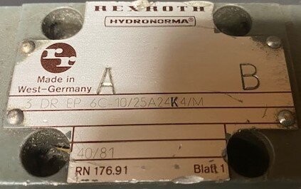 | Additional Details: | Hydronorma EZ 134-481 solenoid. Rexroth-Hydronorma 3 DREP 6 C-10/25A24K4/M pilot valve. |