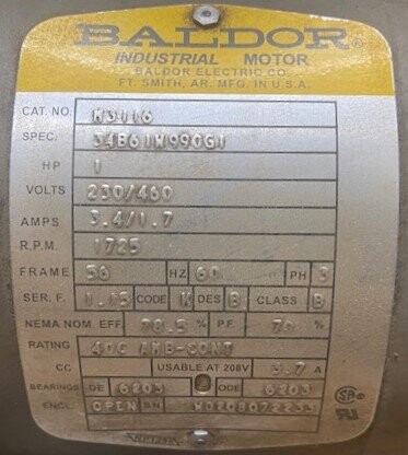 | Power: | 208-230/460VAC - 3.4/1.7A - 60 Hz |