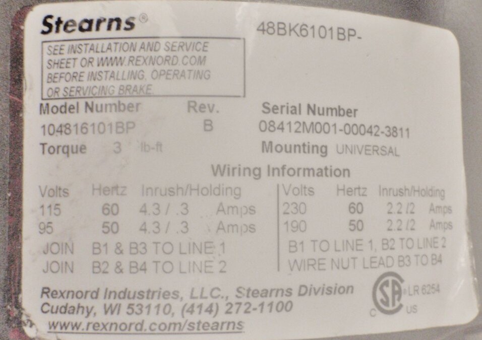 | Additional Details: | Phase: 3, Hz: 60, 56C, Comes with Stearns Break, Model 48BK6101BP |