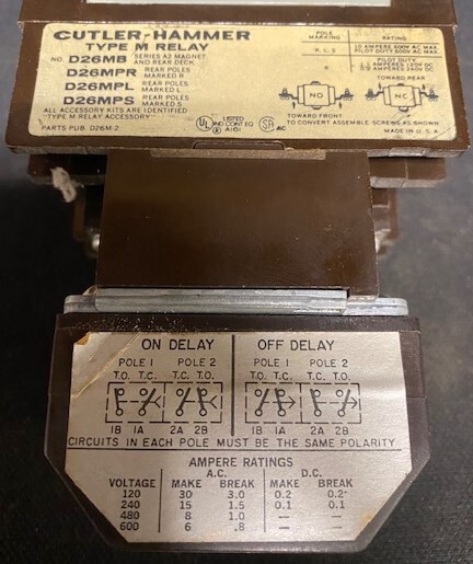 Cutler-Hammer Type M (D26MB, D26MPR, D26MPL, D26MPS) Relay with Cutler-Hammer D26MT Type M Time Delay Attachment