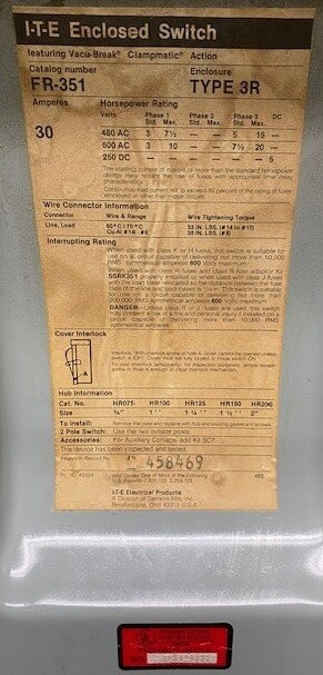 ITE FR351 Type 3R Heavy Duty Vacu-Break Clampmatic Safety Switch