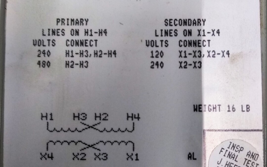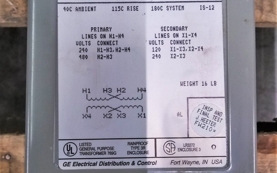 | Power: | 60 Hz, 1 Ph, Primary Voltage 240/480, Secondary Voltage 120/240 |