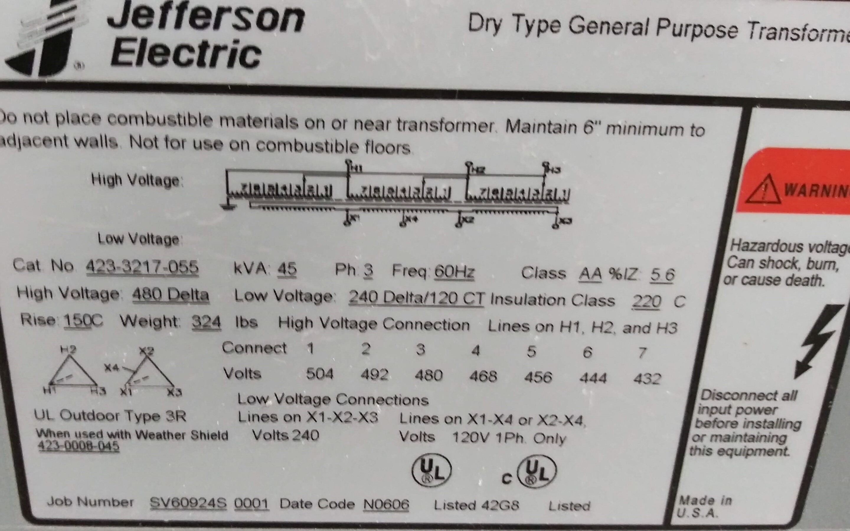 | Name: | Jefferson Electric 423-3217-055 45 KVA, 480 Primary, 240 Secondary |